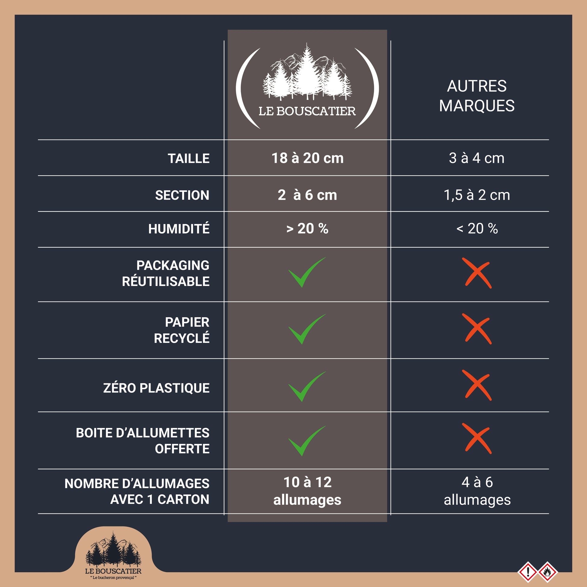 Nos allumes-feu sont de gros calibre permettant ainsi l'utilisation d'un seul allume-feu pour réussir l'allumage de votre feu de bois.